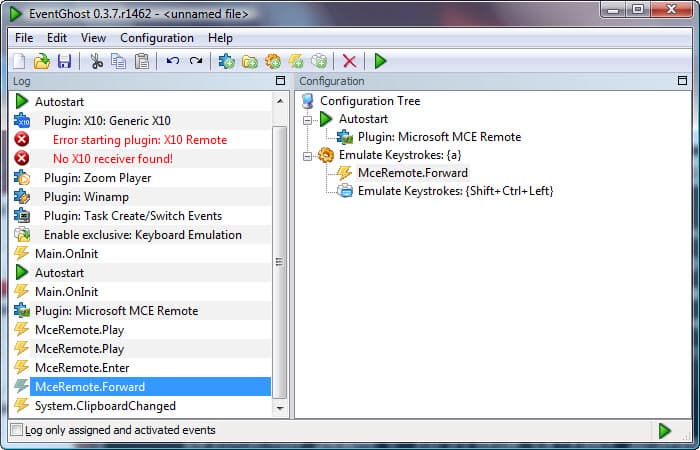 - нажимаем на пульте кнопку, которой будет назначена новая функция, и убеждаемся, что в поле Log появилась новая запись вида MceRemote.Имя_кнопки (например, MceRemote.Forward);