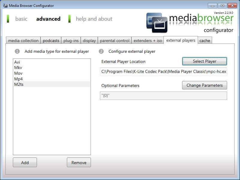 Для интеграции внешнего плеера с Media Browser требуется запустить конфигуратор, переключить режим отображения настроек с basic на advanced и добавить желаемые пары сочетаний «плеер + расширение» на вкладке external players. Такой подход может оказаться немного утомительным, зато более гибким, ведь для каждого расширения можно задать свой плеер или один и тот же, но с разными параметрами командной строки. Обратите внимание, что конфигуратор поддерживает автомонтирование файлов ISO и автозапуск воспроизведения внешним DVD/BD-проигрывателем. Произвести такую настройку можно на вкладке extenders + iso.