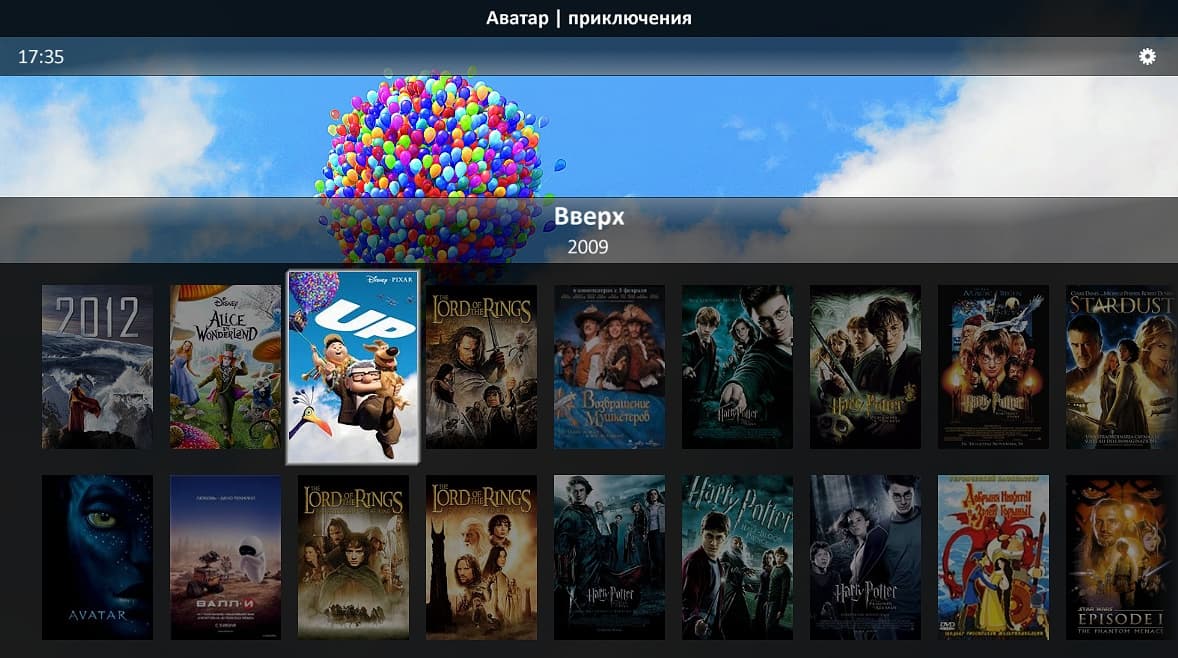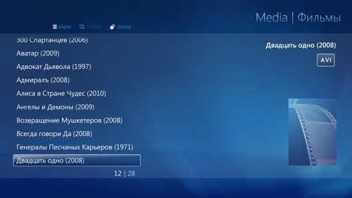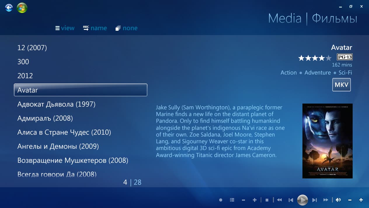 После запуска Media Browser можно убедиться, что категория успешно создалась и папка подхватилась. Внутри категории можно перемещаться по коллекции в одном из пяти режимов отображения (пункт view). Производить сортировку по названию, дате добавления, году выхода, оценкам IMDB, продолжительности и факту просмотра. А также выбирать фильмы не по названию, а по актеру, жанру, студии, году и режиссеру. Уже лучше, чем в «голом» MC, но все-таки далеко не идеал. Как нетрудно увидеть на скриншотах, Media Browser не понял, о каких фильмах идет речь, когда их название указано по-русски. Если использовать оригинальные названия с IMDB.com, информация будет получена в полном объеме с сайта themoviedb.com, но только на английском языке.