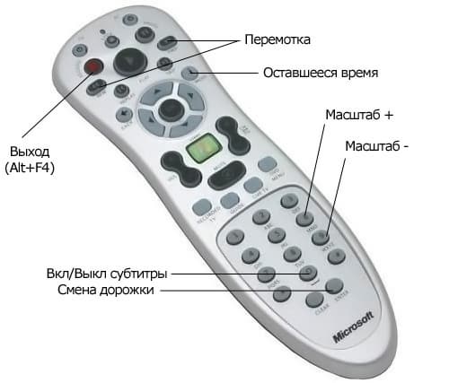 Родной пульт отличает качественная сборка, подсветка основных кнопок управления, а также очень длинный — порядка 3,5 м — шнур от ИК-приемника, что может быть полезно в случае с той самой тумбочкой, о которой упоминалось выше. Забегая вперед, отметим, что с помощью такого (или аналогичного) пульта можно управлять абсолютно любым плеером, поддерживающим горячие клавиши.