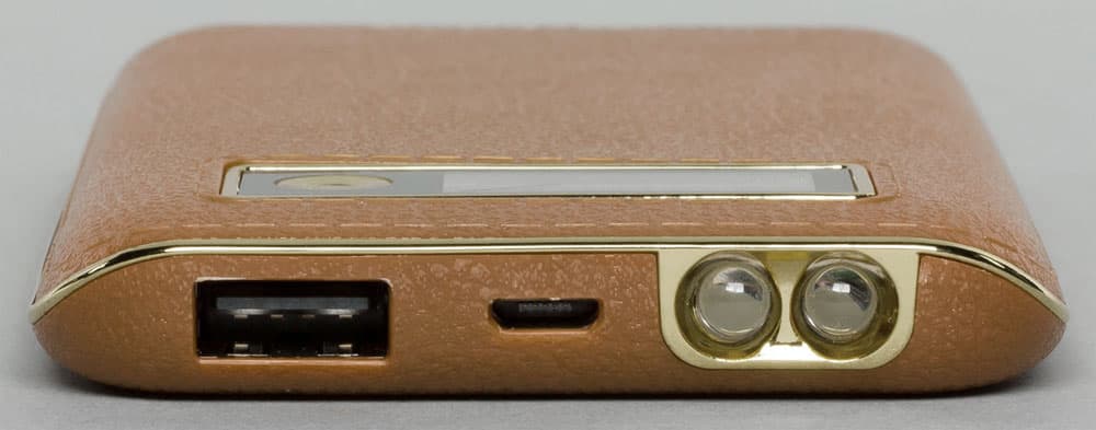 На ближнем к этой панели торце корпуса находятся разъемы: входной Micro-USB для зарядки встроенной аккумуляторной батареи и выходной USB для подключения внешней нагрузки. Там же расположены два ярких белых светодиода, позволяющих использовать устройство еще и в качестве фонарика.
