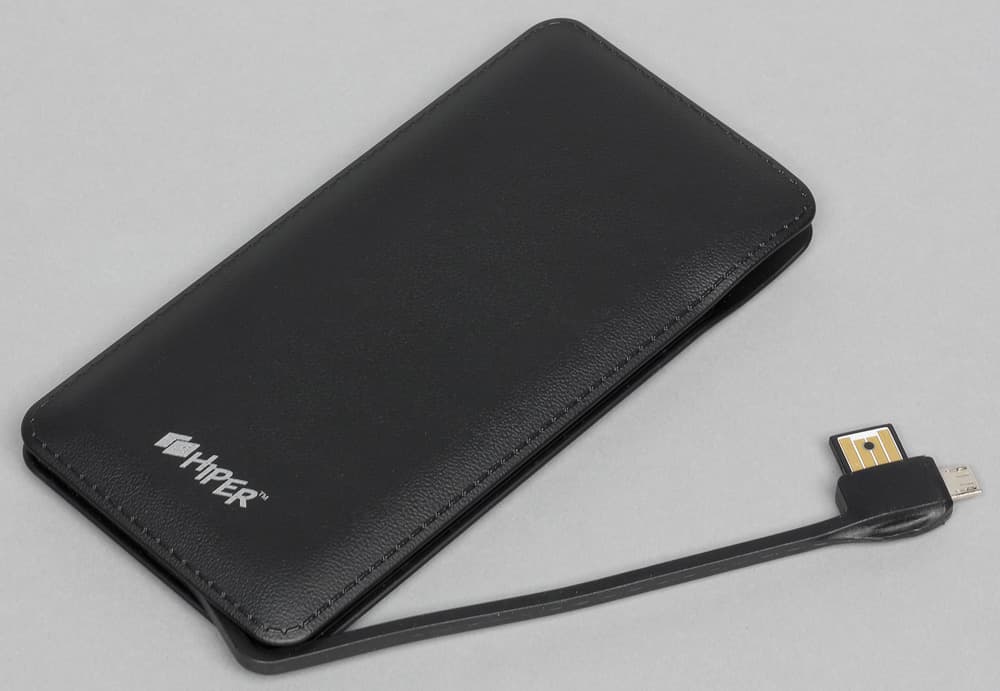 Комплектация в сравнении с другими подобными аппаратами Hiper максимально богатая: два кабеля USB—Micro-USB (разной длины: 23 и 53 см, жаль только, что без маркировки — заявленные входные и выходные токи велики, и было бы интересно уточнить сечение проводов), чехол-кисет из бархатистого материала, в который без труда войдет и сам пауэрбанк, и оба кабеля, а также инструкция на русском языке (правда, ее содержание оставляет желать лучшего: слишком уж краткое).