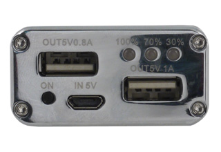 Из заявленных характеристик легко подсчитать, что накопленная в аккумуляторе энергия составляет 9,6 Вт·ч. Конечно, полностью эта энергия быть отдана в нагрузку не может: глубокий разряд аккумулятора недопустим, да к тому же КПД преобразователя, с помощью которого из напряжения батареи 3,7 В получается 5 В, не равен 100%.