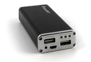 Устройство более универсальное, чем два предыдущих: помимо возможности подключения различных нагрузок, требующих источника 5 В (причем с гораздо бо́льшим током), оно имеет и 12-вольтовый выход, который будет полезен, например, владельцам различных видеокамер (Samsung, JVC, Panasonic и других). Увеличена и емкость встроенного аккумулятора.
