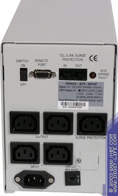 На задней панели расположены тумблер выключения ИБП, разъем RS-232 для подключения управляющего кабеля, по одному входу и выходу RJ-45, 5 розеток IEC-320 для подключения нагрузки (одна из них — только для защиты от всплесков, фильтрующая), разъем питания собственно ИБП, прерыватель цепи ИБП.
