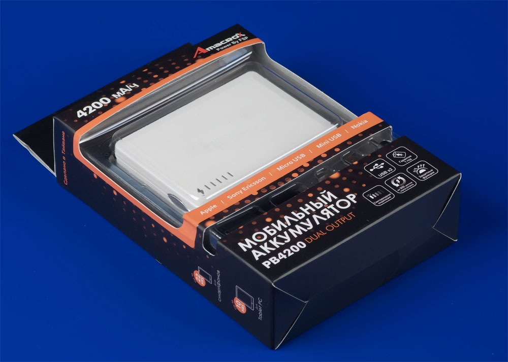 Аккумулятор PB4200 (PB-13) — небольшая коробочка белого цвета, в углу верхней крышки которой расположены светодиоды индикации. Первый показывает состояние при зарядке (желтый — заряжается, зеленый — зарядился), еще четыре синих отображают уровень заряда, зеленый шестой индицирует включение самого устройства, т. е. подачу напряжения 5 В на выходные разъемы.