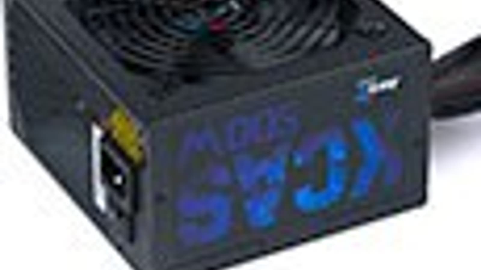 Сам корпус БП, к счастью, просто матовый с весьма освежающей дизайн наклейкой с крупной надписью синего цвета. Вентилятор закрывает черная проволочная решетка, так что БП выглядит весьма неплохо.
