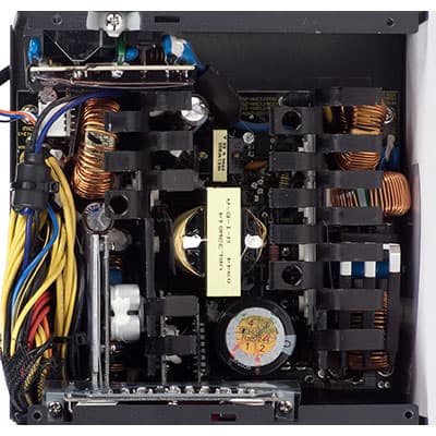 Практически все конденсаторы, установленные в блоке питания, произведены компанией Nippon Chemi-Con. Во входном выпрямителе установлен высоковольтный конденсатор серии SMQ емкостью 420 мкФ, рассчитанный на максимальную рабочую температуру 85 градусов, тогда как в большинстве блоков питания подобной мощности обычно устанавливаются менее емкие конденсаторы емкостью 330-390 мкФ. В выходном каскаде установлены конденсаторы серии KZE, рассчитанные на максимальную рабочую температуру 105 градусов, а также полимерные твердотельные конденсаторы.