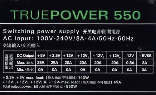 Определяется данный параметр путем суммирования реальной максимальной мощности по шине 12V и мощности 42 Вт по шине 3,3&5V — конечно, при условии, что значения напряжений остаются в пределах нормы.