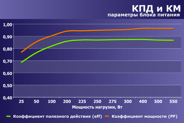 Несмотря на то, что значения КПД данной модели не являются рекордными для современенных блоков питания, этот показатель находится на хорошем уровне.