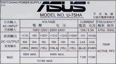Заявленная мощность шины 12V у блока питания ASUS U-75HA составляет 648 Вт, что заметно превышает аналогичный параметр типового блока питания мощностью 450 Вт из Power Supply Design Guide. Мощность шины 3,3&5V также заметно превышает требования PSDG, но в современных системах она останется невостребованной.