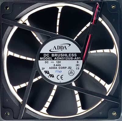 Под вентиляционным отверстием, закрытым проволочной решеткой, установлен нагнетающий вентилятор ADN512UB-A91 типоразмера 120 мм производства ADDA Corporation с максимальный током потребления 0,44 А. Вентилятор основан на подшипнике качения, что должно положительно сказаться на сроке его службы. Скорость вращения указывается производителем как Ultra High.
