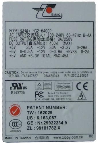 Как и Bluestorm, блоки питания Zippy также были предоставлены в виде самостоятельных устройств, без упаковки, хотя достоверно известно следующее: HG2-6400P поставляется в цветной картонной коробке, в комплект поставки входят: руководство пользователя, шнур питания, адаптер для разъема питания 20-24 контакта, дополнительный 80-мм вентилятор.