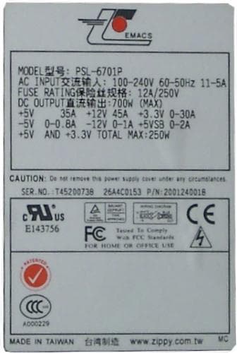 На официальном сайте компании нет информации о комплекте поставки PSL-6701P, но можно предположить, что максимум, чего можно ждать — не более чем шнур питания в комплекте — все-таки серверный блок питания как-никак, никаких ценимых пользователями «довесков» ему и не требуется. Что касается разъемов обоих блоков, то основное отличие заключается в отсутствии у «серверной» модели разъемов питания SATA-приводов и 8-контактного разъема +12 В у «десктопной» модели.