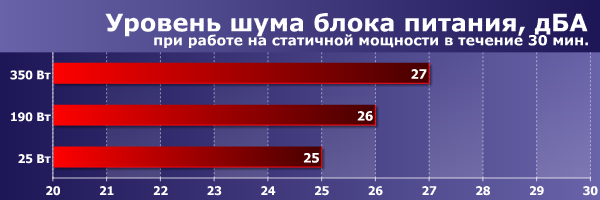 Стоит отметить, что данная модель опережает по уровню акустической эргономики на среднетипичной мощности как ранее протестированные модели из серии Nitro (впрочем, флагманскую модель он опережает незначительно), так и Corsair CX500 V2. В последнем сравнении разница хорошо заметна, правда актуально данное замечание лишь при сравнительно низком уровне фонового шума в помещении и при использовании комплектующих с низким уровнем шума, чему начинающие сборщики «тихих компьютеров» зачастую уделяют недостаточно внимания. И, разумеется, блоку питания нужна нормальная вентиляция, так как скорость вращения встроенного вентилятора регулируется в зависимости от температуры.