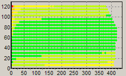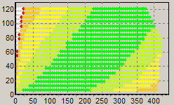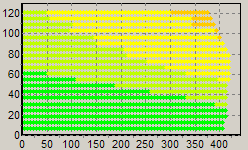 Первым этапом инструментального тестирования является построение кросснагрузочной характеристики (КНХ) и представление ее на полуплоскости, ограниченной максимальной мощностью по шине 3,3&5V с одной стороны (по оси ординат) и максимальной мощностью по шине 12V с другой стороны — по оси абсцисс. В каждой точке измеренное значение напряжения обозначается цветовым маркером в зависимости от отклонения от номинального значения.