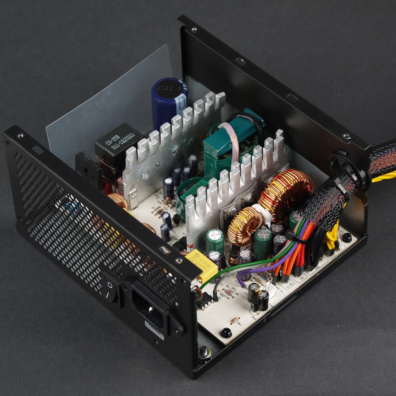 Блок питания оснащен активным корректором коэффициента мощности, дроссель которого упакован в пластиковый корпус. Источник питания рассчитан на работу в электросетях с номинальным напряжением 230 вольт, то есть имеет стандартный, а не расширенный диапазон питающих напряжений.