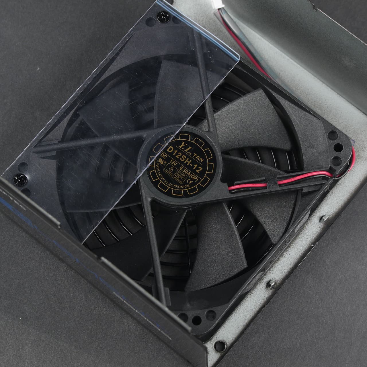 В блоке питания установлен вентилятор типоразмера 120 мм — D12SH-12, имеющий, по данным производителя, максимальную скорость вращения 2200 оборотов в минуту. Вентилятор основан на подшипнике скольжения и произведен компанией Yate Loon Electronics. С точки зрения замены штатного вентилятора ситуация неплохая, так как подобный типоразмер довольно широко распространен среди вентиляторов, имеющихся в продаже. Подключается вентилятор через двухконтактный разъем.