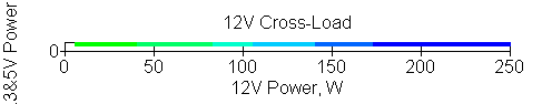 Следующим этапом инструментального тестирования является построение кросснагрузочной характеристики (КНХ) и представление ее на четвертьплоскости, ограниченной максимальной мощностью по шине 3,3&5 В с одной стороны (по оси ординат) и максимальной мощностью по шине 12 В с другой стороны — по оси абсцисс. В каждой точке измеренное значение напряжения обозначается цветовым маркером в зависимости от отклонения от номинального значения.