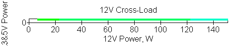 Следующим этапом инструментального тестирования является построение кросснагрузочной характеристики (КНХ) и представление ее на четвертьплоскости, ограниченной максимальной мощностью по шине 3,3&5 В с одной стороны (по оси ординат) и максимальной мощностью по шине 12 В с другой стороны — по оси абсцисс. В каждой точке измеренное значение напряжения обозначается цветовым маркером в зависимости от отклонения от номинального значения.