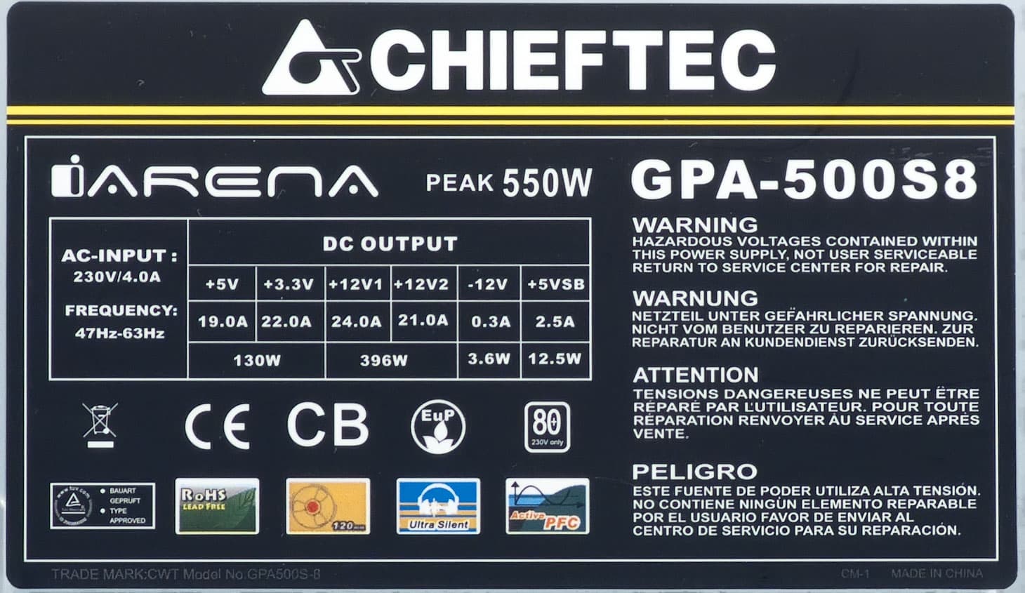 Все необходимые параметры указаны на корпусе блока питания в полном объеме. Для мощности шины +12VDC заявлено значение 396 Вт. Данная величина находится между соответствующими значениями типовых блоков питания мощностью 450 и 550 Вт, соотношение мощности по шине +12VDC и полной мощности составляет 0,792, что является низким показателем для современных решений подобной мощности. >