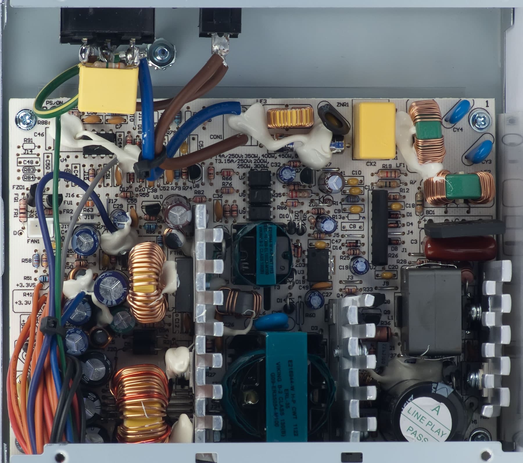 Массо-габаритные характеристики теплорассеивающих элементов, а также общий вид элементов во внутреннем объеме БП, скорее соответствуют очень дешевому четырехсотваттнику.