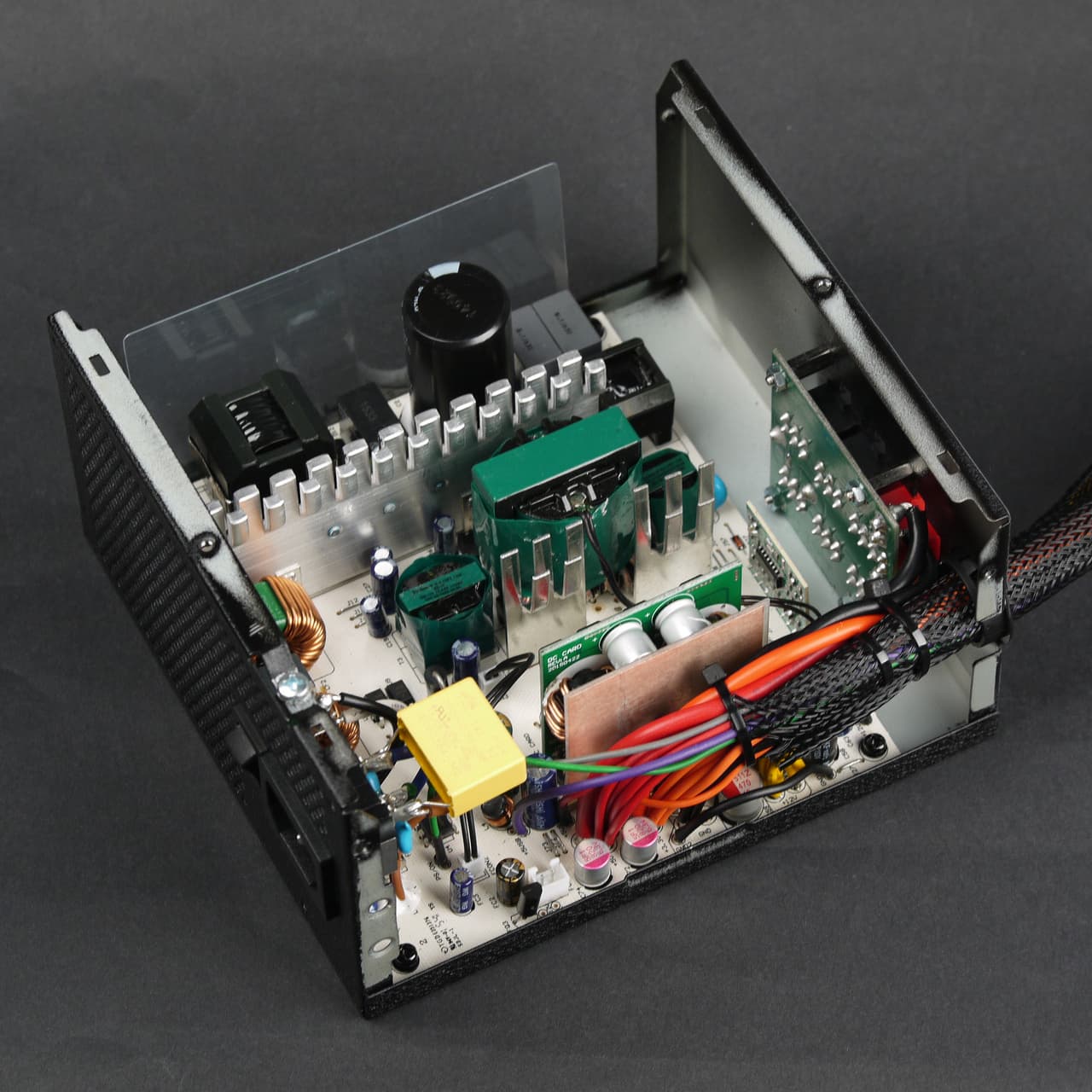 Блок питания оснащен активным корректором коэффициента мощности, дроссель которого упакован в пластиковый корпус в открытом исполнении. Источник питания рассчитан на работу в электросетях с номинальным напряжением от 100 до 240 вольт, то есть имеет расширенный диапазон питающих напряжений. Это может оказаться полезным при работе от сети, в которой имеются значительные отклонения от номинальных значений напряжения.