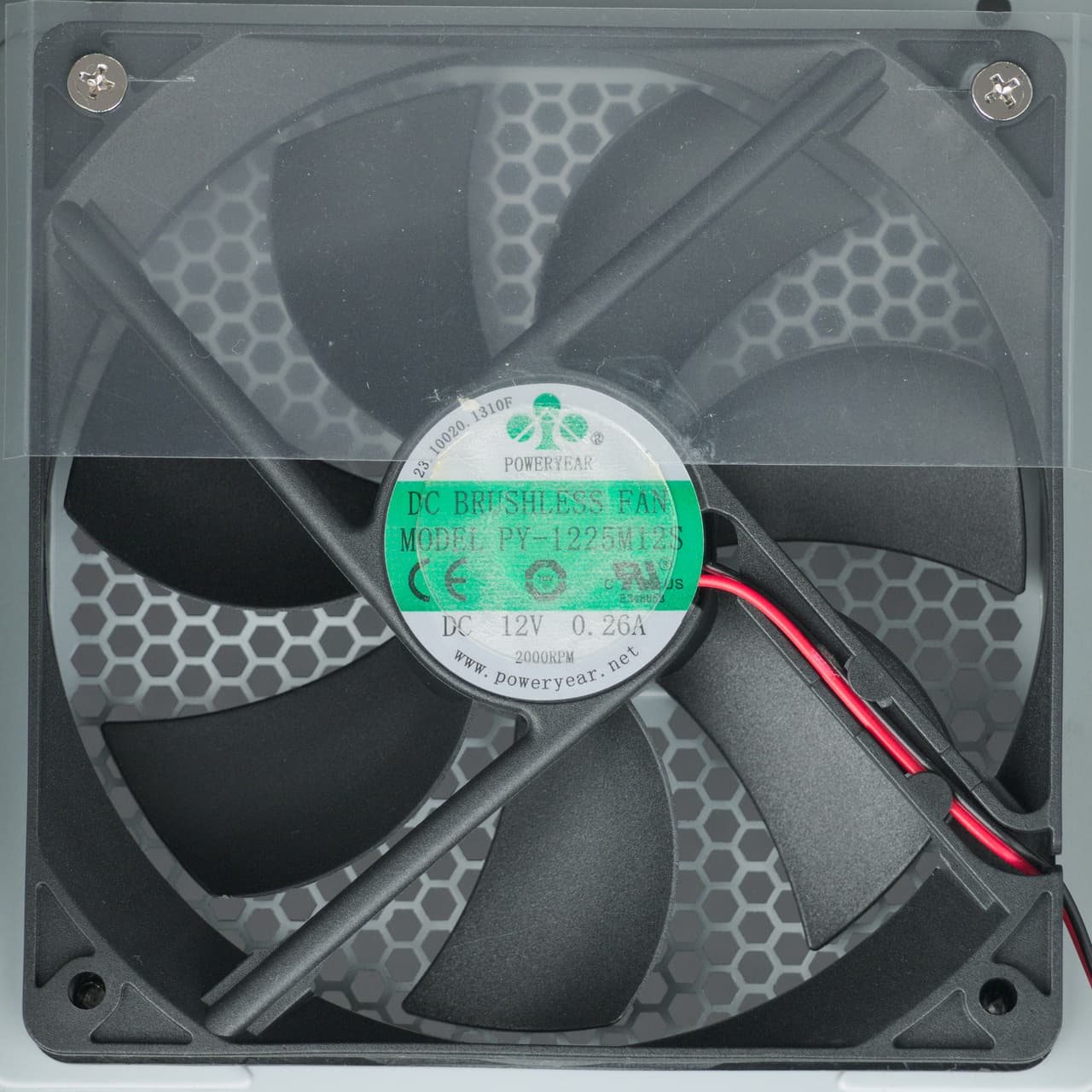 В блоке питания установлен вентилятор типоразмера 120 мм Poweryear PY-1225M12S, который, судя по маркировке, имеет скорость вращения 2000 оборотов в минуту. Вентилятор выполнен на основе подшипника скольжения. Подключение двухпроводное, разъемное, так что поменять вентилятор будет несложно.