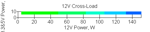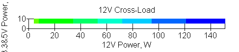 Следующим этапом инструментального тестирования является построение кросснагрузочной характеристики (КНХ) и представление ее на четвертьплоскости, ограниченной максимальной мощностью по шине 3,3&5 В с одной стороны (по оси ординат) и максимальной мощностью по шине 12 В с другой стороны — по оси абсцисс. В каждой точке измеренное значение напряжения обозначается цветовым маркером в зависимости от отклонения от номинального значения.