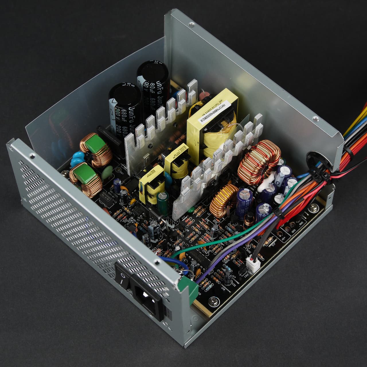 Внутреннее устройство блока питания напоминает дешевые решения родом из нулевых годов. Именно так зачастую выглядели бюджетные блоки питания разных, преимущественно малоизвестных производителей — впрочем, большинство из них выглядели еще хуже. Тут, по крайней мере, собран простейший фильтр помех, есть одноразовый предохранитель, а трансформатор и дроссель групповой стабилизации имеют адекватные размеры, да и радиаторы все-таки вполне пристойные, толщиной около 3 мм. На первый взгляд, работать эта конструкция должна. Конденсаторы Jun Fu и дешевый вентилятор на подшипнике скольжения не вызывают особого оптимизма, но вряд ли можно найти принципиально более качественные компоненты в блоке питания подобной ценовой категории.