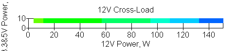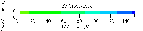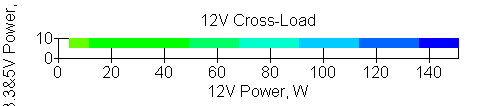 Следующим этапом инструментального тестирования является построение кросснагрузочной характеристики (КНХ) и представление ее на четвертьплоскости, ограниченной максимальной мощностью по шине 3,3&5 В с одной стороны (по оси ординат) и максимальной мощностью по шине 12 В с другой стороны — по оси абсцисс. В каждой точке измеренное значение напряжения обозначается цветовым маркером в зависимости от отклонения от номинального значения.