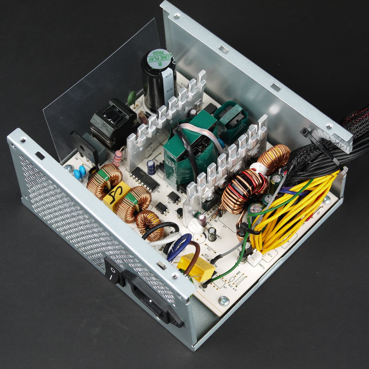Блок питания оснащен активным корректором коэффициента мощности, дроссель которого упакован в пластиковый корпус. Источник питания рассчитан на работу в электросетях с номинальным напряжением от 100 до 240 вольт, то есть имеет расширенный диапазон питающих напряжений, что может оказаться полезным при работе от сети, в которой имеются значительные отклонения от номинальных значений.
