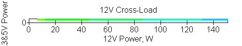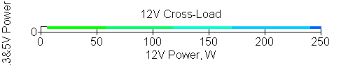 Следующим этапом инструментального тестирования является построение кросснагрузочной характеристики (КНХ) и представление ее на четвертьплоскости, ограниченной максимальной мощностью по шине 3,3&5 В с одной стороны (по оси ординат) и максимальной мощностью по шине 12 В с другой стороны — по оси абсцисс. В каждой точке измеренное значение напряжения обозначается цветовым маркером в зависимости от отклонения от номинального значения.