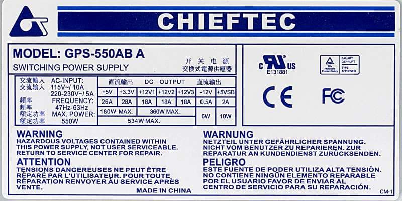 Мощность шины 12V у блока питания Chieftec GPS-550AB-A составляет 360 Вт, что в точности соответствует типовому блоку питания мощностью 450 Вт из Power Supply Design Guide, мощность шины 3,3&5V заметно превышает требования PSDG, но в современных системах она останется невостребованной.