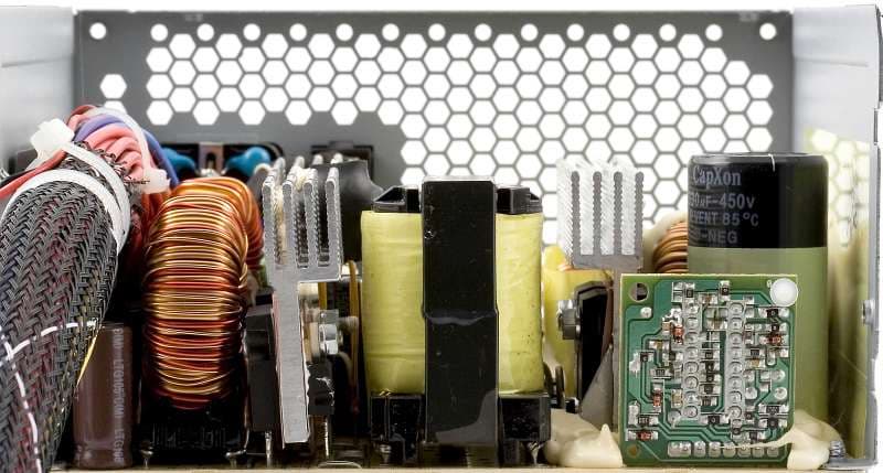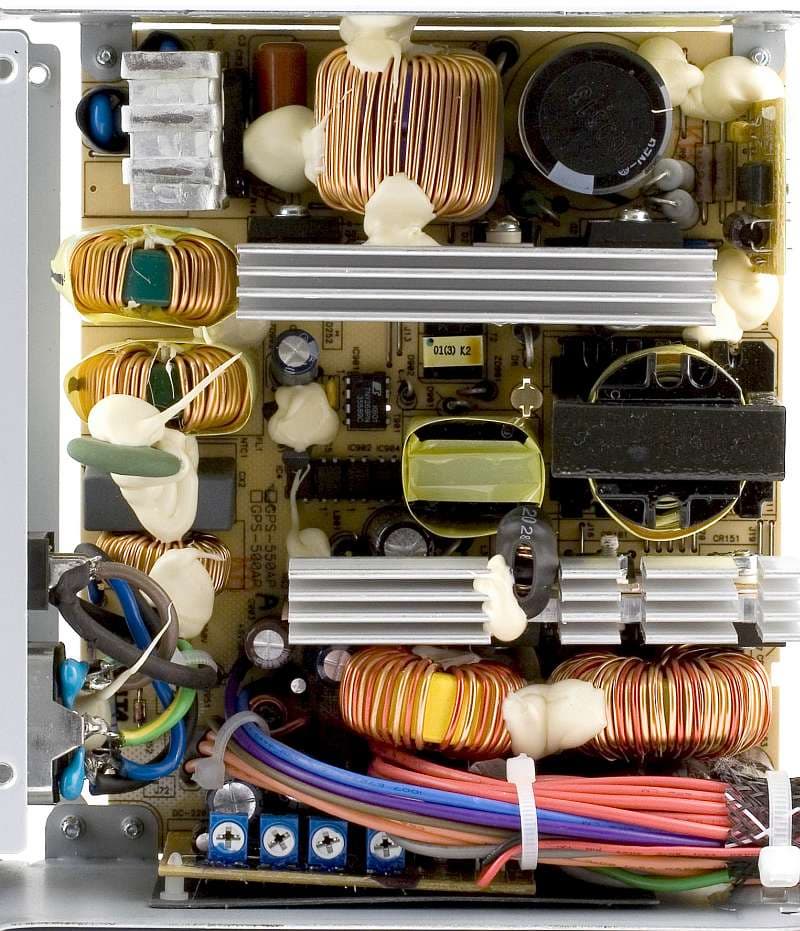 Компоновка элементов внутри блока питания имеет достаточно низкую плотность, что, в принципе, должно способствовать улучшению охлаждения и хорошему теплоотводу, и, как следствие, невысокому нагреву блока питания.