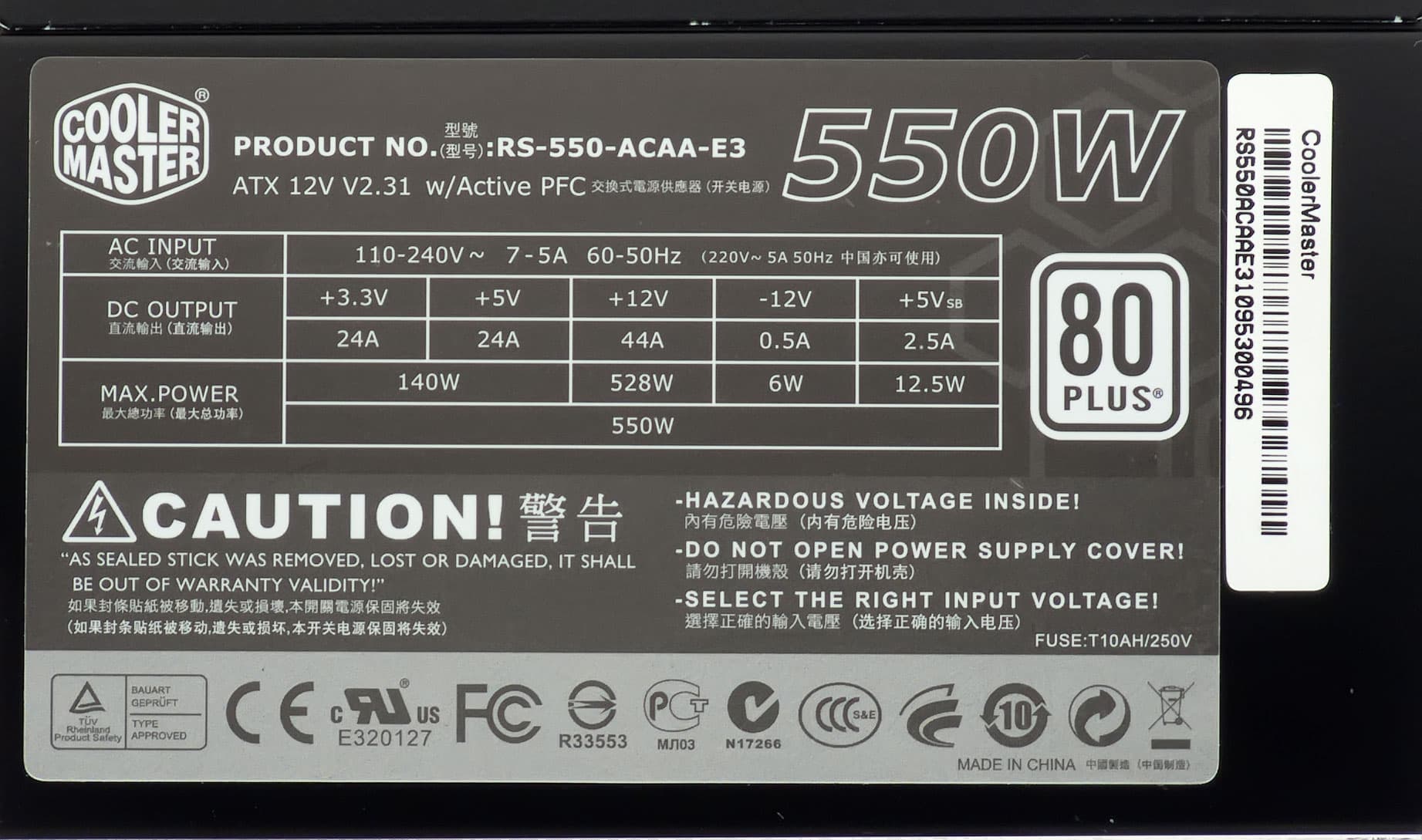 | Cooler Master GX 550 (RS-550-ACAA-E3) | 24 | 24 | 44 | − | − | − | 140 | 528 | 550 | 0,96 |