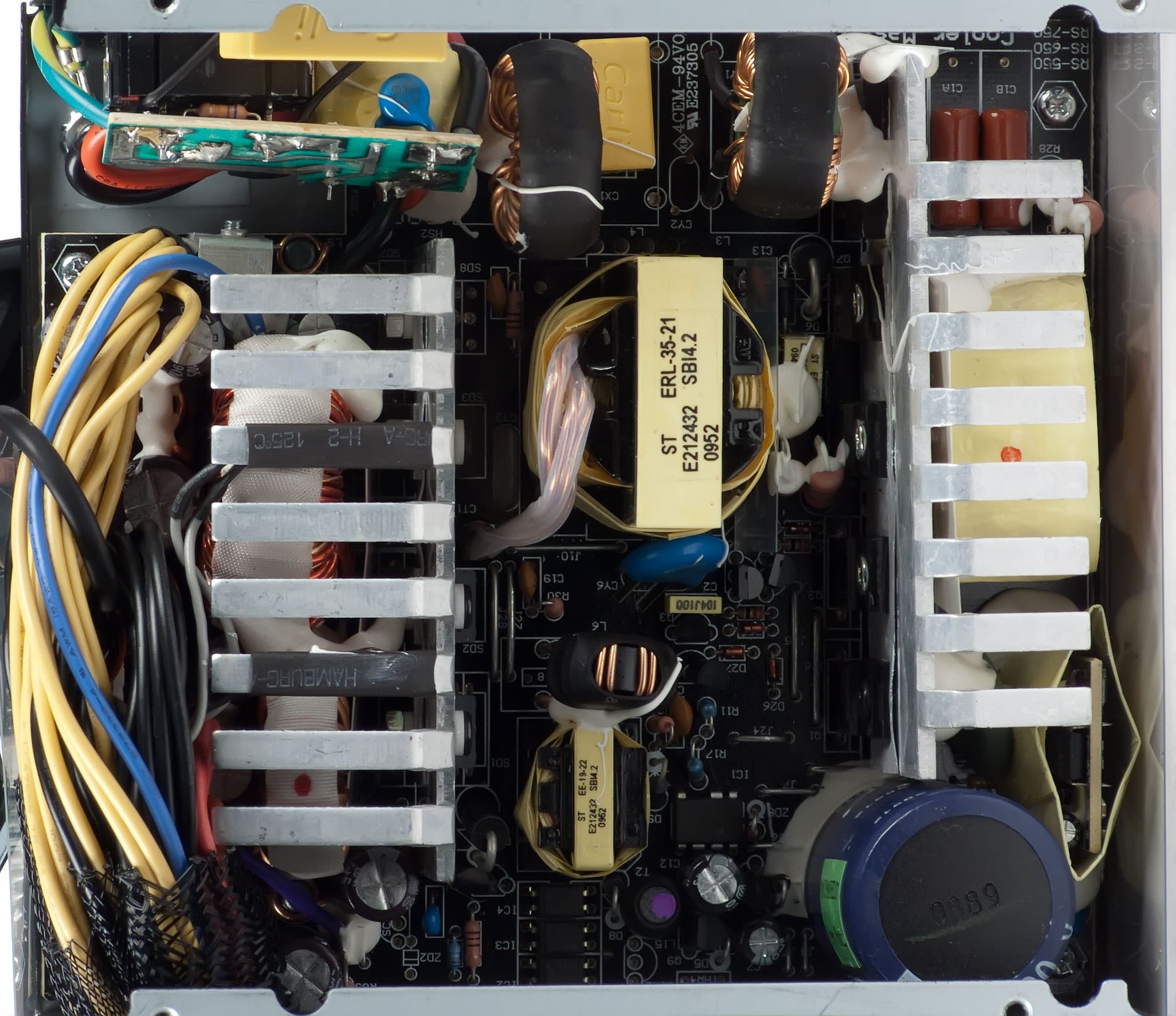 Практически все конденсаторы, установленные в блоке питания, произведены компанией Su’scon. Во входном выпрямителе установлен конденсатор емкостью 390 мкФ (400 В), рассчитанный на максимальную рабочую температуру 85 градусов — это вполне типично для блока питания мощностью 550 ватт. В выходном каскаде установлены конденсаторы рассчитанные на максимальную рабочую температуру 105 градусов.