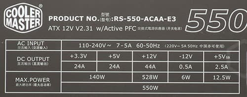 Все необходимые параметры указаны на корпусе блока питания в полном объеме. Мощность шины +12VDC заявлена в значении 528 Вт. Данная величина находится между соответствующими значениями типовых блоков питания мощностью 550 и 600 Вт, соотношение мощности по шине +12VDC и полной мощности составляет 0,96, что является достойным показателем.