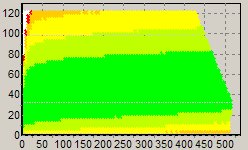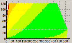 Первым этапом инструментального тестирования является построение кросснагрузочной характеристики (КНХ) и представление ее на полуплоскости ограниченной максимальной мощностью по шине 3,3&5V с одной стороны (по оси ординат) и максимальной мощностью по шине 12V с другой стороны — по оси абсцисс. В каждой точке измеренное значение напряжение обозначается цветовым маркером в зависимости от отклонения от номинального значения.