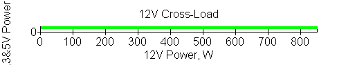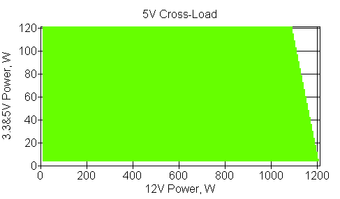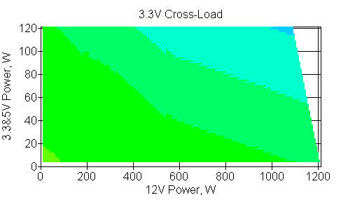 Следующим этапом инструментального тестирования является построение кросснагрузочной характеристики (КНХ) и представление ее на четвертьплоскости, ограниченной максимальной мощностью по шине 3,3&5 В с одной стороны (по оси ординат) и максимальной мощностью по шине 12 В с другой стороны — по оси абсцисс. В каждой точке измеренное значение напряжения обозначается цветовым маркером в зависимости от отклонения от номинального значения.