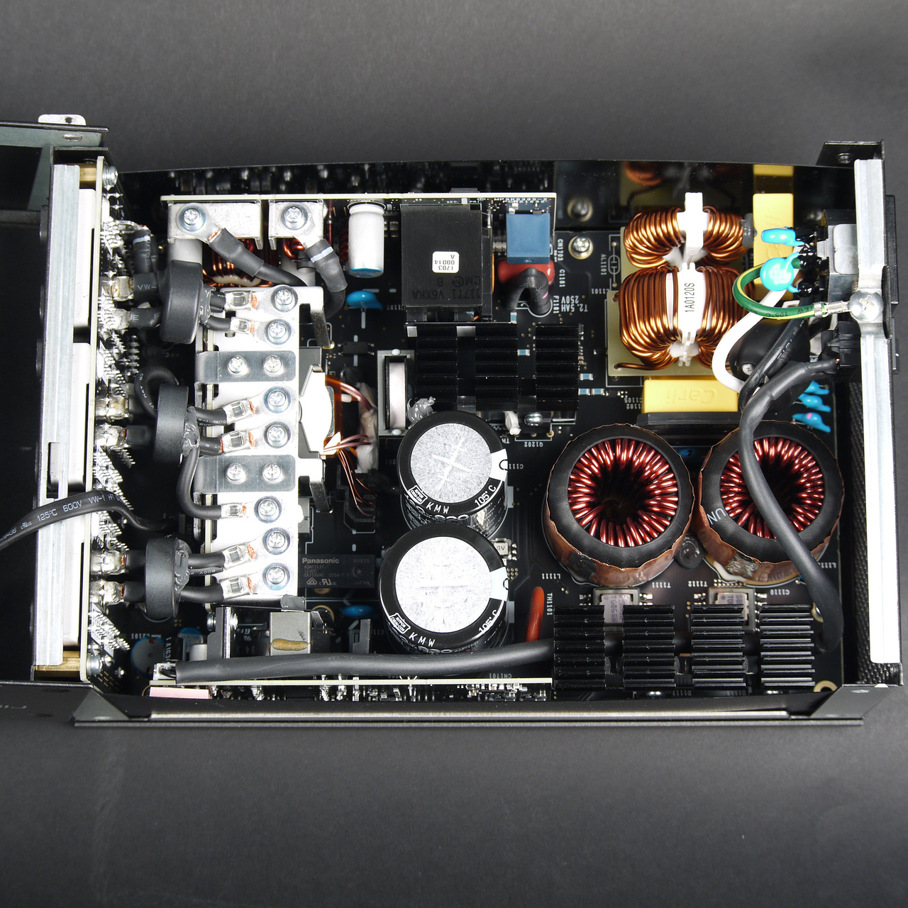 Основные полупроводниковые элементы размещены на нескольких радиаторах, импульсные источники питания на основе преобразователей постоянного тока напряжений +3.3VDC и +5VDC располагаются на дочерней плате.