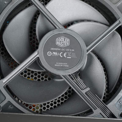 Cooler Master MasterWatt Maker 1200 MIJ имеет гибридную систему охлаждения, что означает возможность функционирования БП не только при активном, но и при пассивном охлаждении. Управление запуском вентилятора производится в зависимости и от температуры, и от мощности: при нагрузке от 520 Вт вентилятор стартует с минимальной задержкой даже при включении БП из холодного состояния. Подобный алгоритм работы является однозначным достоинством данной модели, так как при работе на высокой мощности не требуется прогрева компонентов для включения активного охлаждения, что минимизирует количество циклов старт/стоп, а также обеспечивает более щадящий тепловой режим эксплуатации компонентов блока питания.