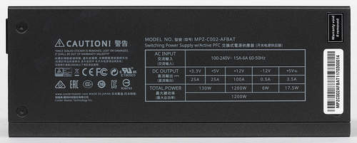 Все необходимые параметры указаны на корпусе блока питания в полном объеме, для мощности шины +12VDC заявлено значение 1200 Вт. Соотношение мощности по шине +12VDC и полной мощности составляет 1,0 — это максимальный и, разумеется, отличный показатель.