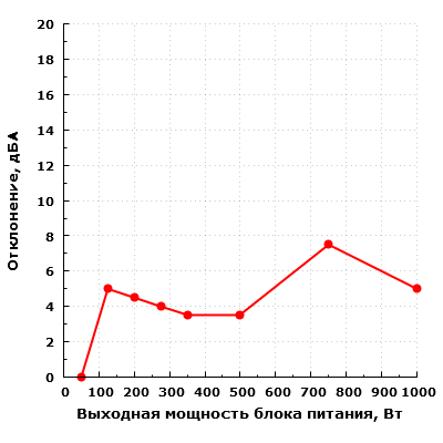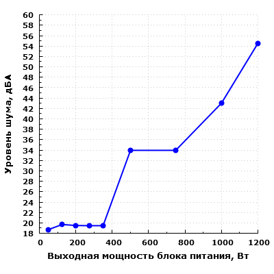 Дальнейшее повышение мощности нагрузки приводит к сильному увеличению уровня шума блока питания. Уже при работе на мощности 1000 Вт шум превышает значение 40 дБА, его уровень можно оценить как весьма высокий. На максимальной мощности шум становится экстремально высоким и превышает 50 дБА.