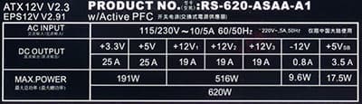 Заявленная мощность шины 12 В у блока питания Cooler Master Real Power M 620 составляет 516 Вт, что заметно превышает аналогичный параметр типового блока питания мощностью 450 Вт из Power Supply Design Guide. Мощность шины 3,3&5 В также сильно превышает требования PSDG, но в современных системах она останется невостребованной.