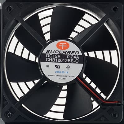 Под вентиляционным отверстием, закрытым проволочной решеткой, установлен нагнетающий вентилятор CHB12012BS-O типоразмера 120 мм, производства Cheng Home Electronic. Максимальный ток потребления — 0,24 А.