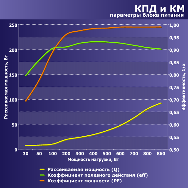Согласно нашим измерениям, КПД данного БП достигает значения свыше 90 процентов в диапазоне мощности от 100 до 860 ватт, максимальное зарегистрированное значение составило чуть больше 93 процентов — на мощности 400 Вт. Одновременно с этим, КПД на мощности 50 Вт составил около 85,7 процентов, на мощности 30 Вт — около 79,5 процентов. В целом показатели отличные для современных блоков питания подобной мощности, и даже на малой мощности КПД весьма приличный.