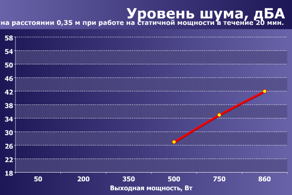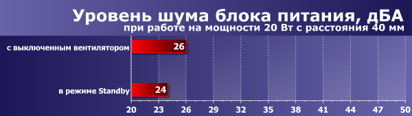 При подготовке данного материала мы использовали новую методику измерения уровня шума блоков питания, которая пока имеет статус экспериментальной. Блок питания располагается на ровной поверхности вентилятором вверх, над ним на расстоянии 0,35 метра размещается измерительный микрофон шумомера Октава 110А-Эко, которым и производится измерение уровня шума. Нагрузка блока питания осуществляется при помощи специального стенда, имеющего бесшумный режим работы. В ходе измерения уровня шума осуществляется эксплуатация блока питания на постоянной мощности в течение 20 минут, после чего производится замер уровня шума.