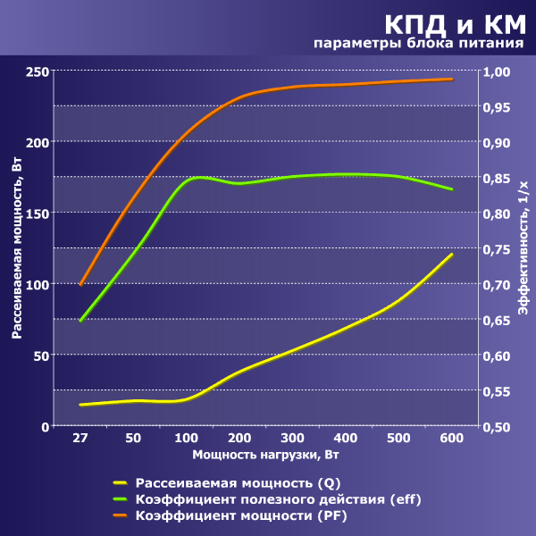 Очередной этап тестирования заключается в измерении полной мощности, подведенной к блоку питания, активной мощности, потребленной им, и в расчете коэффициента полезного действия и коэффициента мощности.