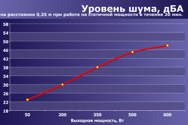 При нагрузке в 500 Вт шум блока питания преодолевает эргономичный уровень в 40 дБА при условии настольного размещения, то есть при расположении блока питания в ближнем поле по отношению к пользователю. Ничего страшного в этом нет, так как в реальности «раскочегарить» блок питания до такого уровня будет весьма непросто, особенно если принять хотя бы минимальные меры по организации нормальной вентиляции в корпусе системного блока.